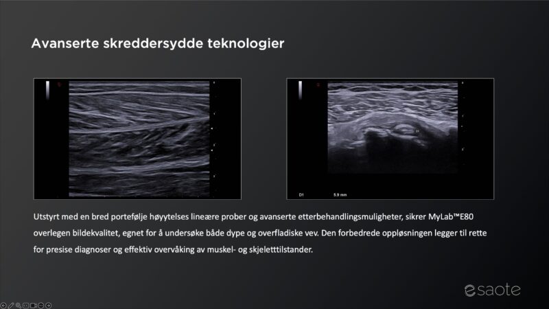 Mylab E80, er Esaote´s nyeste modell og plasserer seg mellom X90 og X75. Du ser strukturer tydeligere enn noensinne og alt dette i et meget stilig design og et ekstremt lavt støynivå. Høy «framerate» for dynamiske undersøkelser. En super sensitiv og stabil fargedoppler gir en dopplerfølsomhet man ikke finner maken til, kombinert med markedets høyeste frekvenser.
