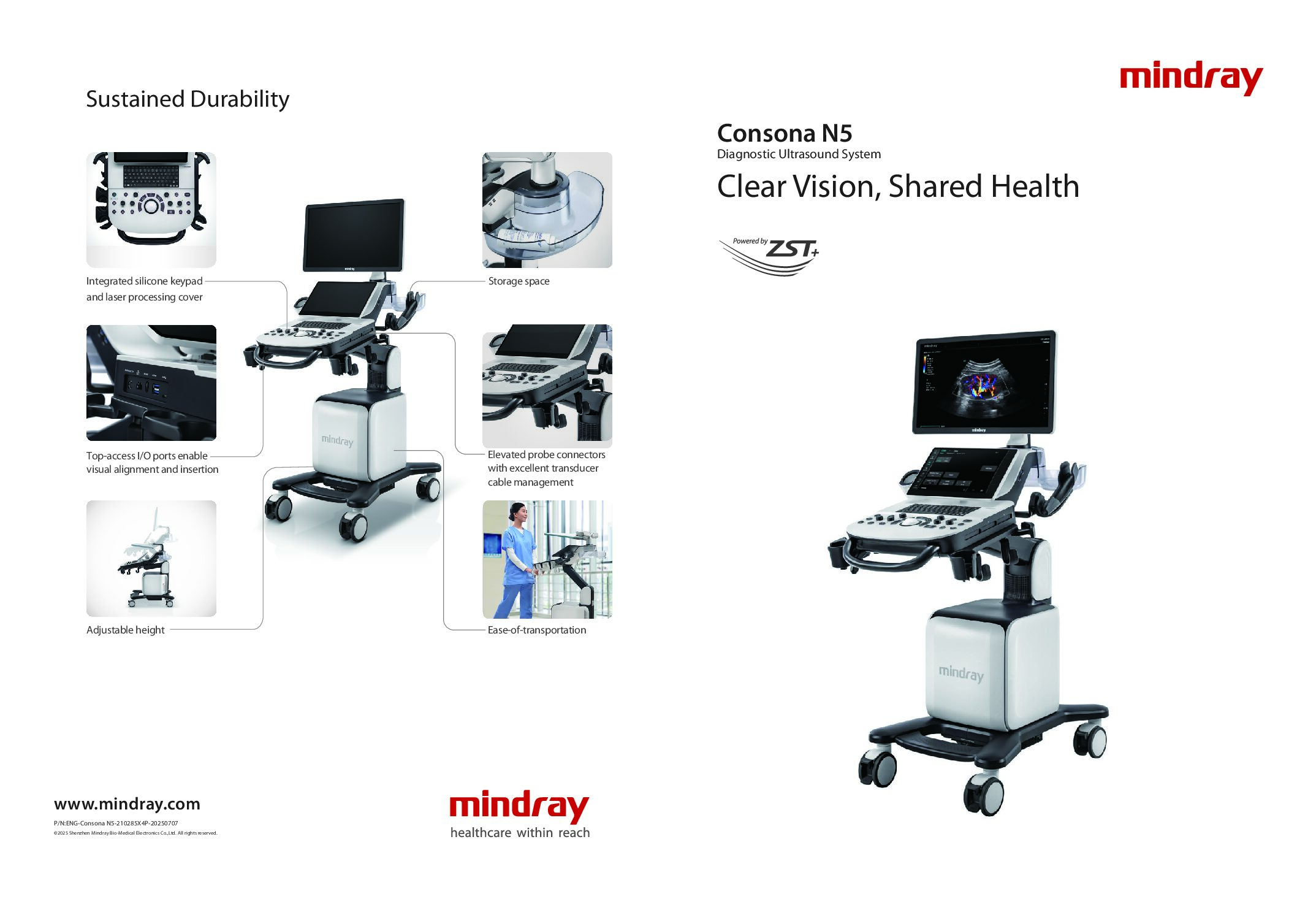 Consona N5 er et smart og kraftig ultralydapparat utviklet for å gjøre avansert bildekvalitet tilgjengelig i primærhelsetjenesten. Med ZST⁺‑teknologi – Mindrays mest moderne bildeplattform – får du en løsning som gir eksepsjonell detaljgjengivelse, bedre penetrasjon og kontinuerlig bildeoptimalisering.